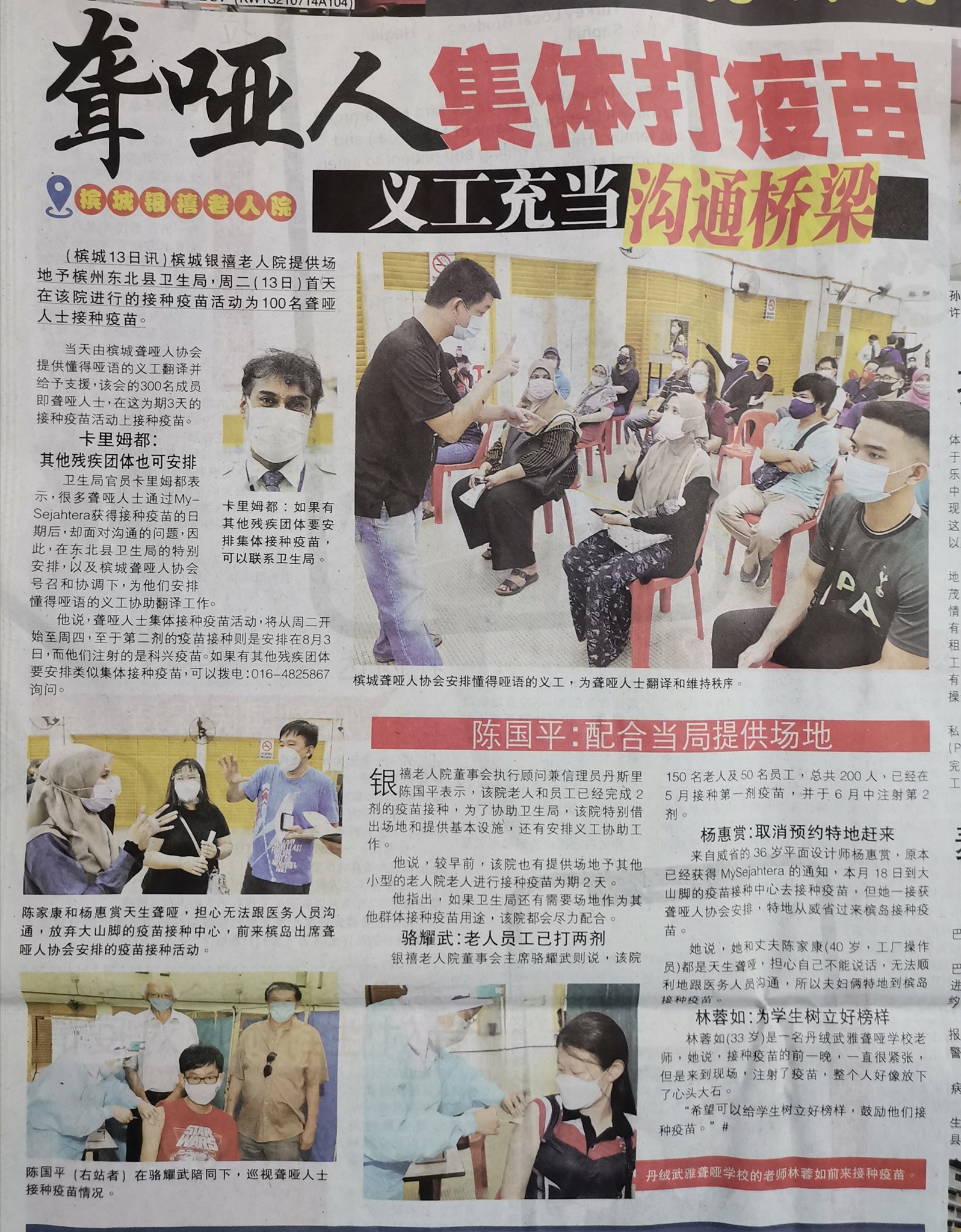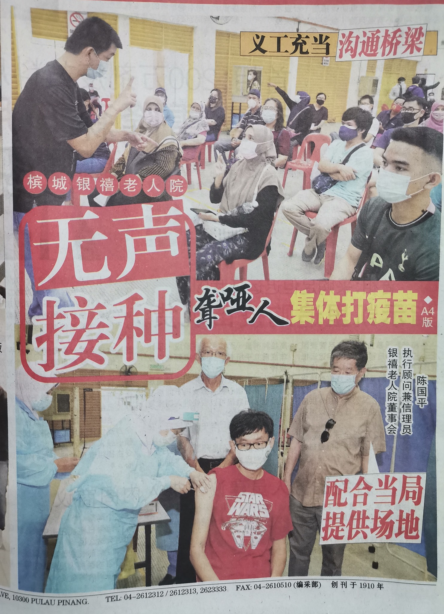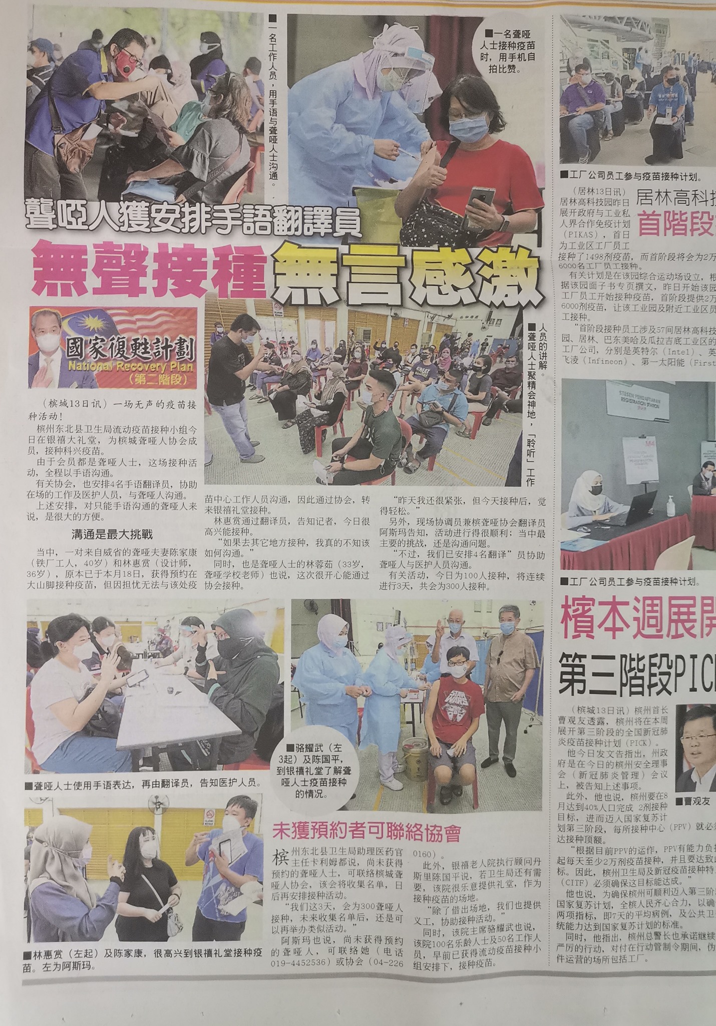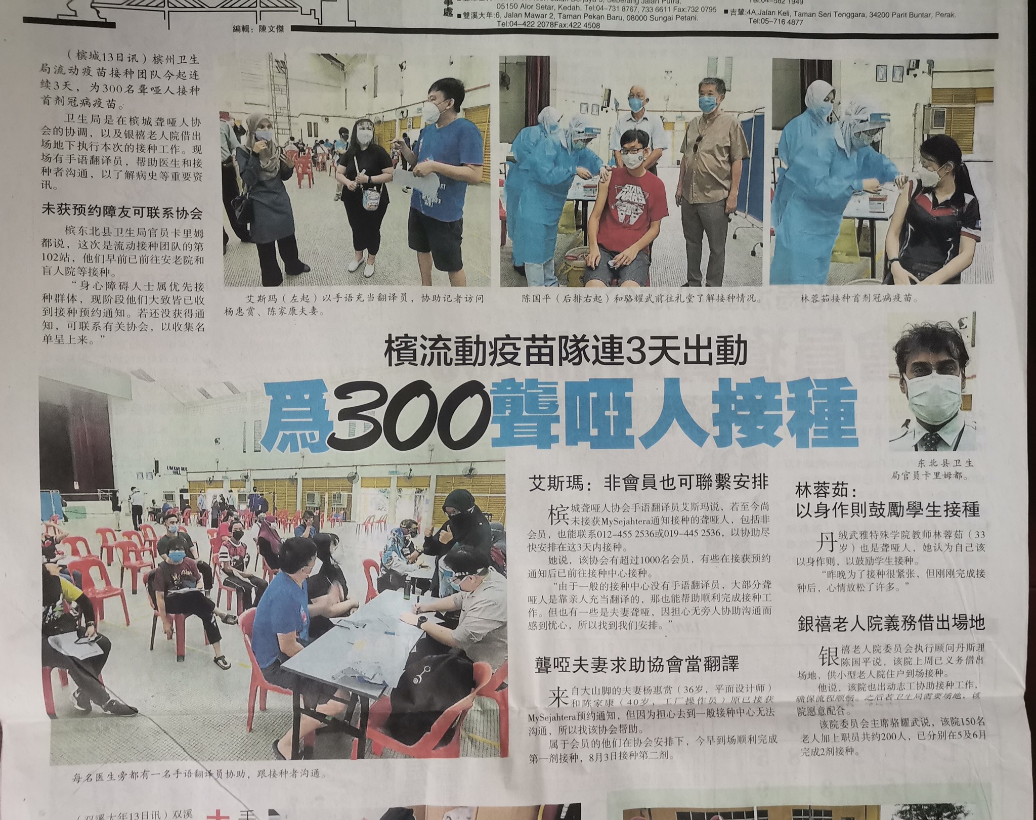 Program Vaksin Orang Pekak Pulau Pinang diadakan selama tiga hari dari 13 Julai hingga 15 Julai 2021. Persatuan Orang Pekak Pulau Pinang bekerjasama dengan Jabatan Kesihatan Negeri dan Pejabat Kesihatan Daerah Timur Laut untuk mengadakan vaksinasi bagi tiga ratus orang pekak.
